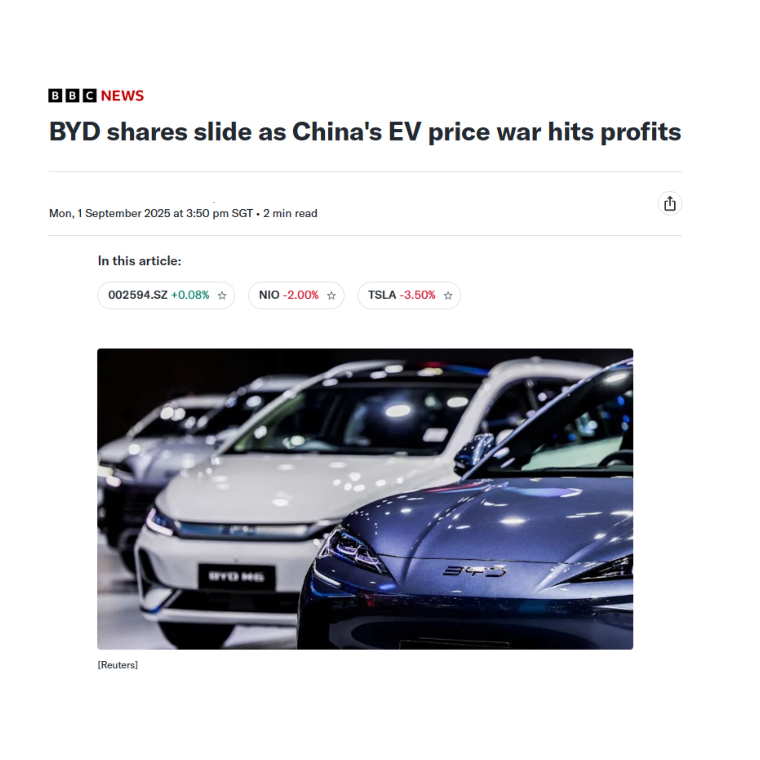 Shares in Chinese electric vehicle maker BYD slid by as much as 8% on Monday after it reported a drop in profit because of a price war in China's car sector. BYD's “surprising” performance suggests that even the leader of China's EV sector won't necessarily win from a "cut-throat" price war, said industrial policy expert Prof Laura Wu from NTU in Singapore.