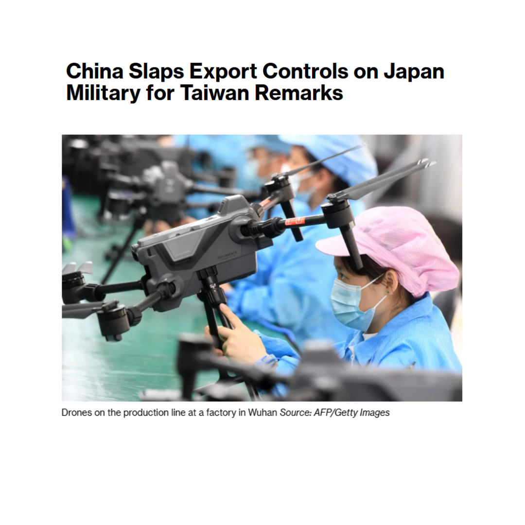 China imposed controls on exports to Japan with any military use, intensifying a dispute between Asia’s top economies over remarks Japanese Prime Minister Sanae Takaichi made last year on Taiwan. All dual-use items are banned from being exported to Japan for military use effective immediately, China’s Ministry of Commerce said in a statement Tuesday. The wording of the curbs is vague enough that it theoretically means China could hit Japanese imports “even if they were for civil use,” said Dylan Loh, associate professor at NTU. “Whether they actually do that is a separate question.”