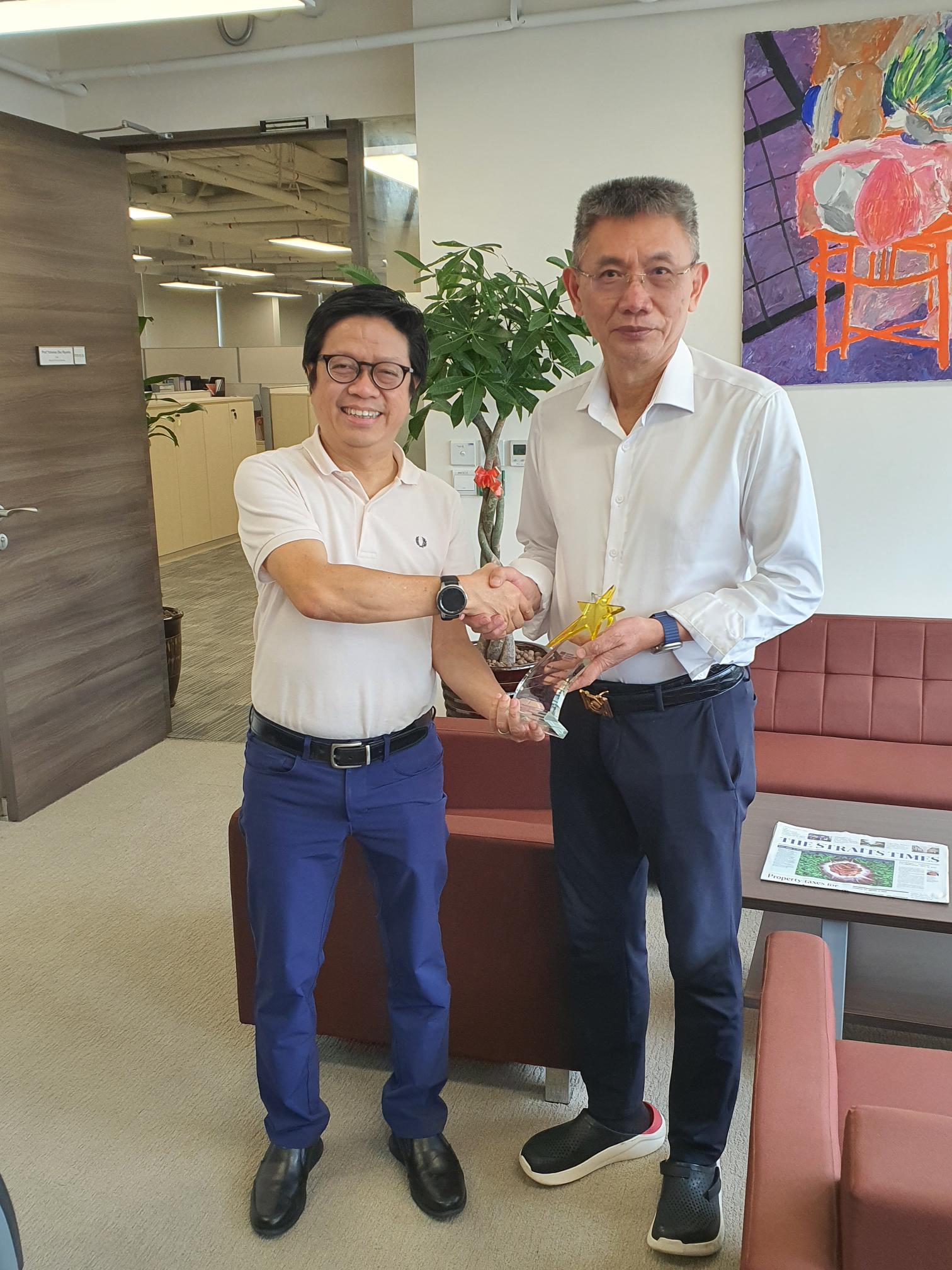 The photograph shows a memorable moment as our Chair of SSS@NTU, Prof Eko (left), shares a heartfelt exchange with Associate Prof. Wu Wei on the right.