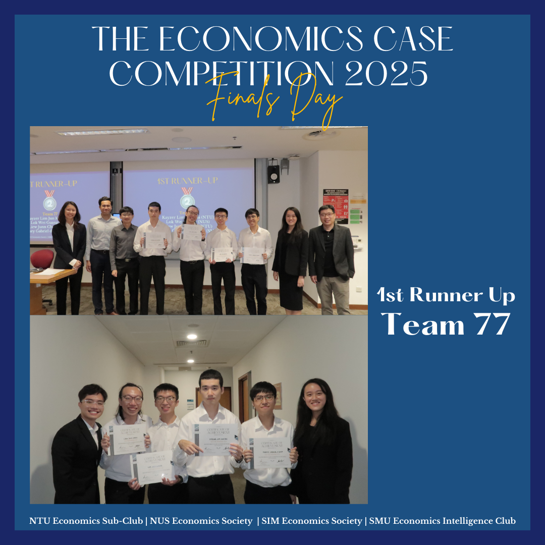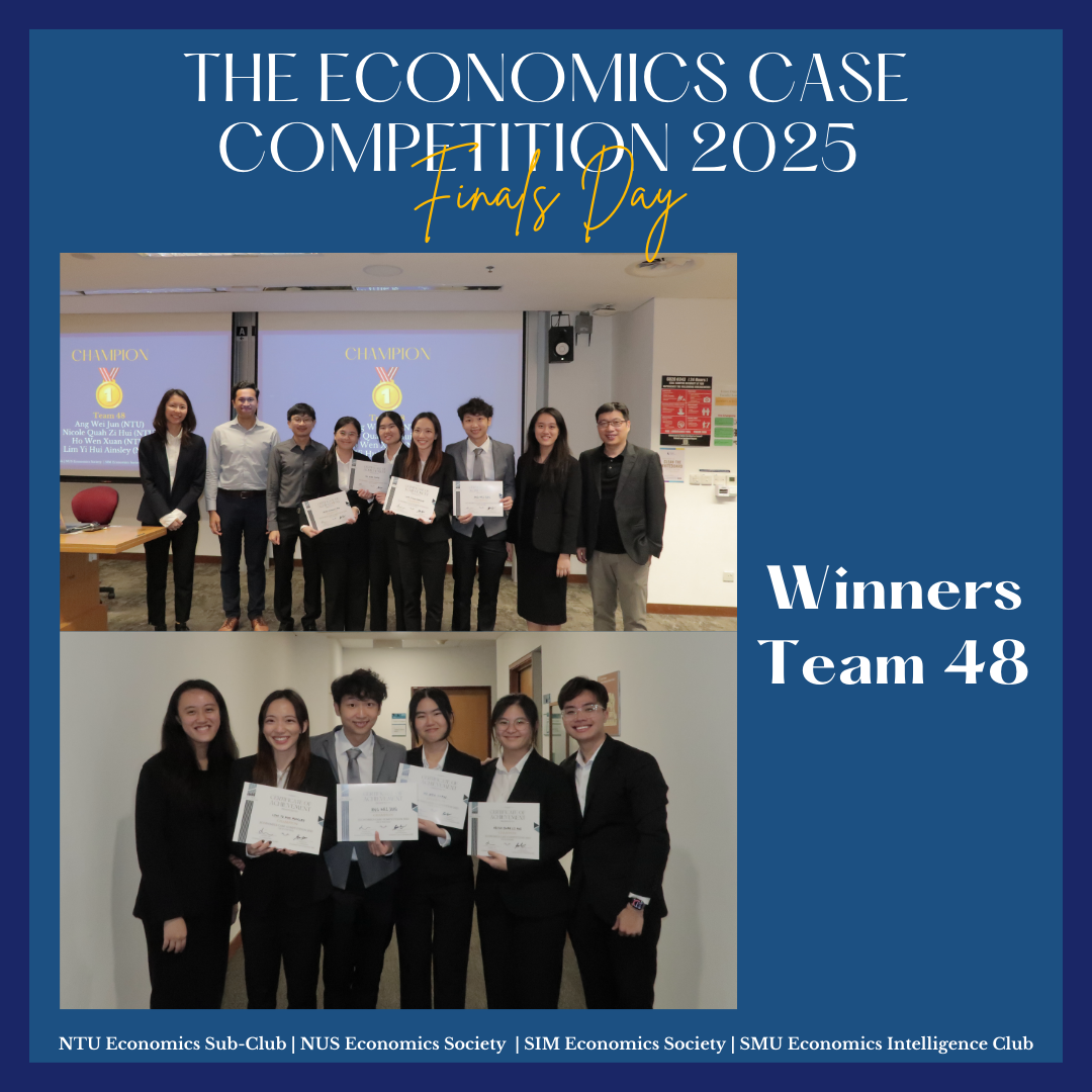 We are proud to share that NTU students have emerged as top winners in the Inaugural Economics Case Competition 2025, held in collaboration with NUS, SMU, and SIM. This student-led initiative was co-organised by the NTU Economics Sub-Club together with the NUS Economics Society, SMU Economics Intelligence Club, and SIM Economics Society.
