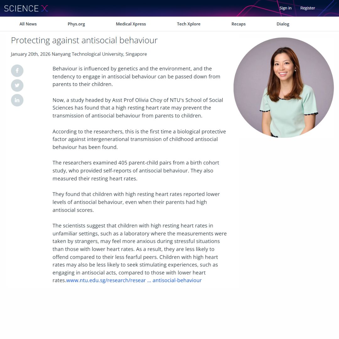 A study headed by Assoc Prof Olivia Choy of NTU's SSS has found that a high resting heart rate may prevent the transmission of antisocial behaviour from parents to children. According to the researchers, this is the first time a biological protective factor against intergenerational transmission of childhood antisocial behaviour has been found. The researchers examined 405 parent-child pairs from a birth cohort study, who provided self-reports of antisocial behaviour. They also measured their resting heart rates. They found that children with high resting heart rates reported lower levels of antisocial behaviour, even when their parents had high antisocial scores.