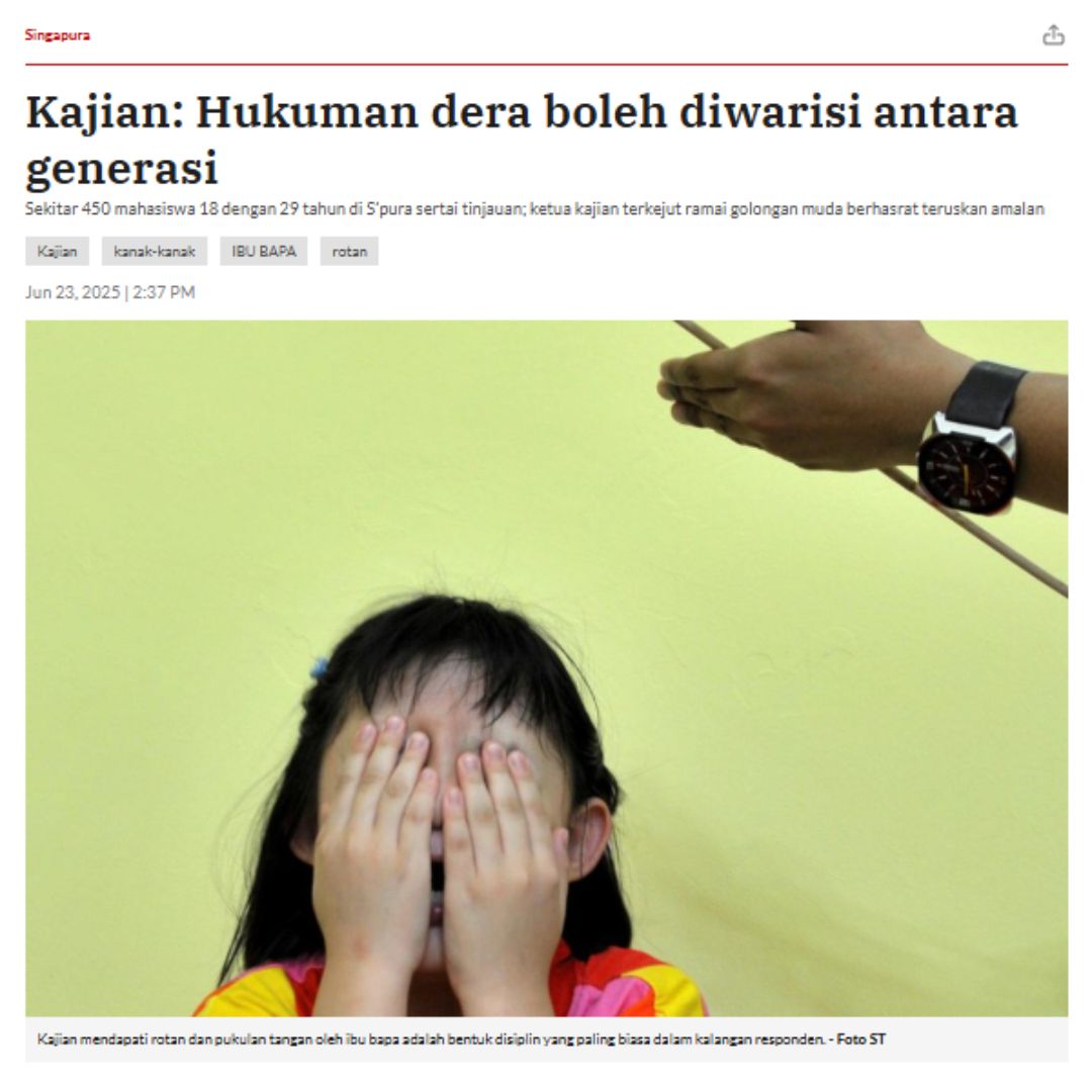 Young adults who were physically punished as children are far more likely to say they intend to hit their own children in the future, compared with those who were not physically disciplined. This is one key finding from a new study which sheds light on how corporal punishment is passed down from one generation to the next, led by a psychology professor from NTU. And this is especially pertinent in Singapore, where such practices remain common. Assoc Prof Setoh Pei Pei, who led the study, said: “The norms are so strong that we may not really question or reflect: Does it have to be this way? We should take this opportunity to reflect on our approach to discipline. Not as a tool for punishment or control, but to guide and teach, and help our children learn the skills they need to make good choices on their own.”