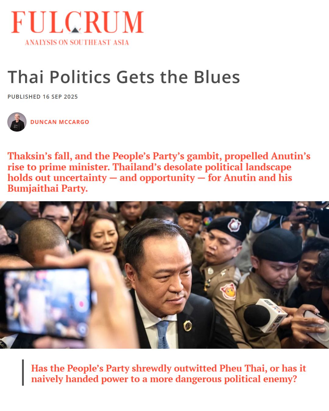 Prof Duncan McCargo’s article “Thai Politics Gets the Blues” (Fulcrum, September 2025) examines how Thailand’s political landscape has shifted dramatically since the colourful and ideologically divided 2023 election. The piece explores how Prime Minister Anutin Charnvirakul’s Bhumjaithai Party has ascended through pragmatic alliances, while the generational and ideological divides that once stood out have started to blur.