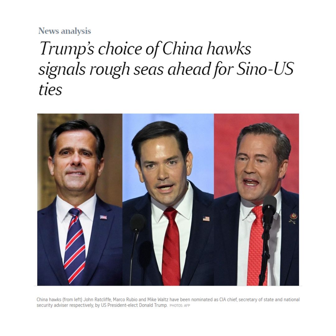 Foreign policy experts have projected that Beijing is in for an unprecedentedly tough time, now that Trump has begun to stack his new Cabinet with China hawks. While China has had the experience of dealing with Trump and his shock-and-awe approach and is better prepared to take the hits this time around, it needs to brace itself for a relationship that will be marked by greater confrontation and decoupling. “The Chinese will see this as Trump throwing down the gauntlet,” said Assoc Prof Hoo Tiang Boon, who studies China’s foreign policy and US-China relations at NTU Singapore. “Trump made this move out of his own political considerations, not necessarily because of specific foreign policy considerations,” he added. “But from the Chinese perspective, it will be seen as a slap in the face, and it will certainly create complications.”