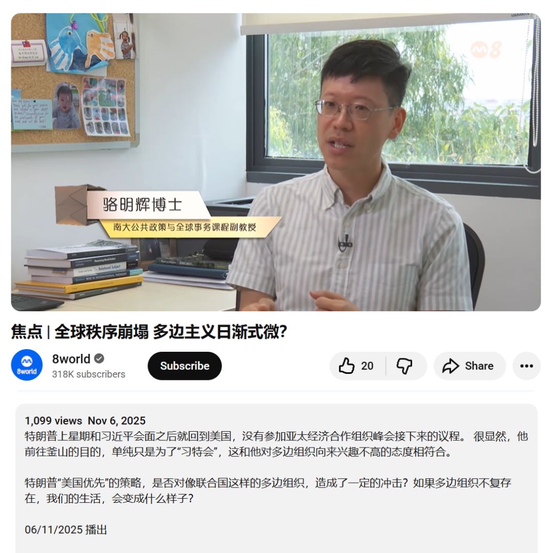 Many experts have observed that while the role of global multilateral organizations such as the United Nations and the World Trade Organization has declined, smaller multilateral systems, such as the Shanghai Cooperation Organisation and BRICS, have begun to strengthen. NTU's Assoc Prof Dylan Loh stated that the current trend is for some countries to organise and jointly launch measures or address regional or specific issues. He added "The function of multilateralism should not be to serve the competition between China and the United States; it must be able to operate independently."
