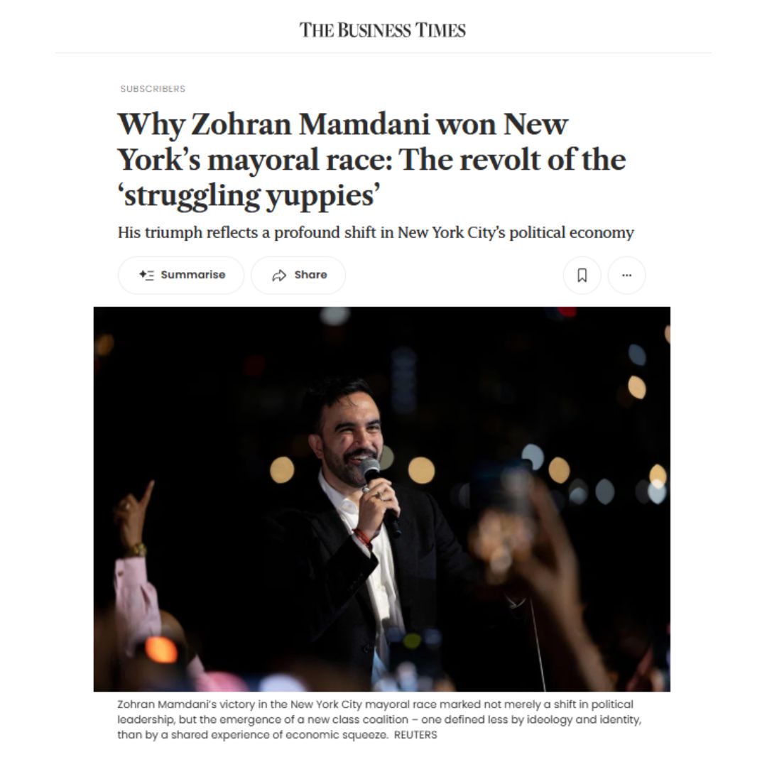 In a commentary, NTU Emeritus Professor of Economics Tan Kong Yam and Clement Chan, managing director of a Hong Kong–based boutique fund, noted that the downwardly mobile professional class - or “struggling yuppie” voters who are highly educated, culturally liberal but economically trapped - propelled Zohran Mamdani, a self-described socialist, to power in New York, the capital of capitalism. Their rise to political prominence reflects deep structural shifts in advanced urban economies, driven by persistent elite overproduction, soaring rents and limited housing supply, childcare costs outpacing wages, labour markets unfriendly to mid-career mobility, asset gains skewed toward older cohorts, and inflation in urban services.