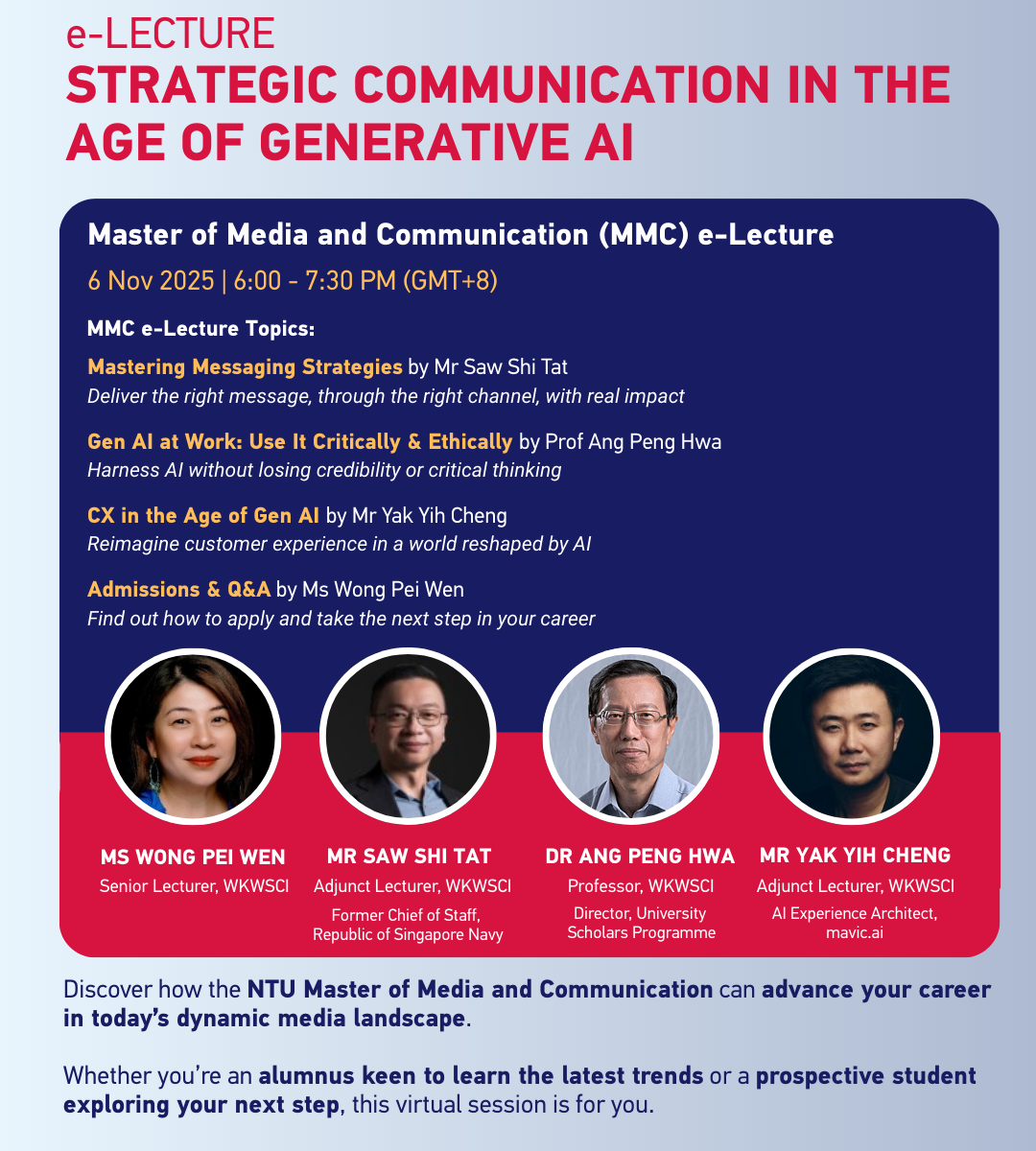Whether you’re looking to deepen your expertise, pivot to a new role, or step into leadership, the Wee Kim Wee School of Communication and Information (WKWSCI) Graduate Programmes by Coursework are designed to equip working professionals with the skills and knowledge to thrive in today’s fast-changing industries.